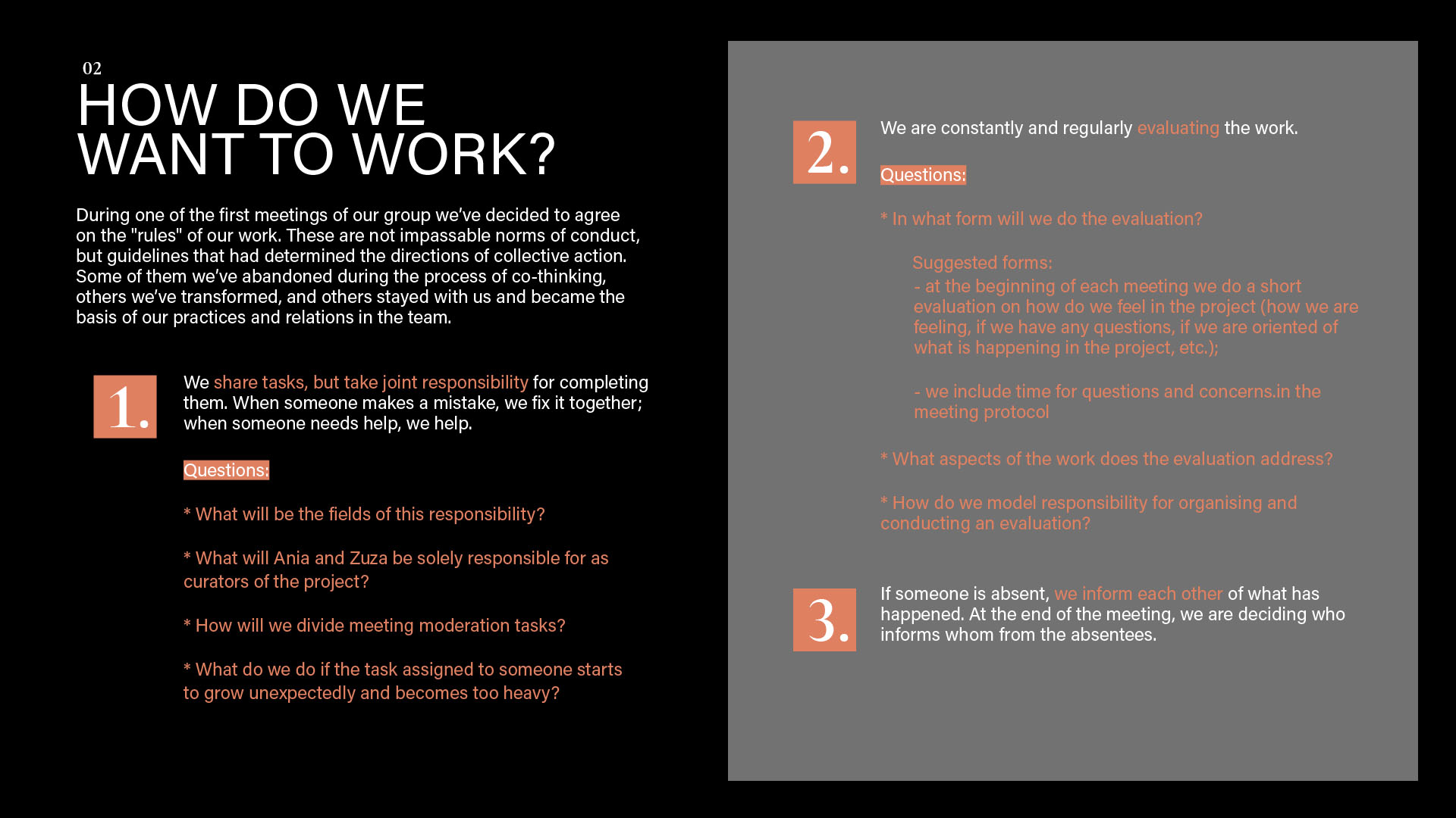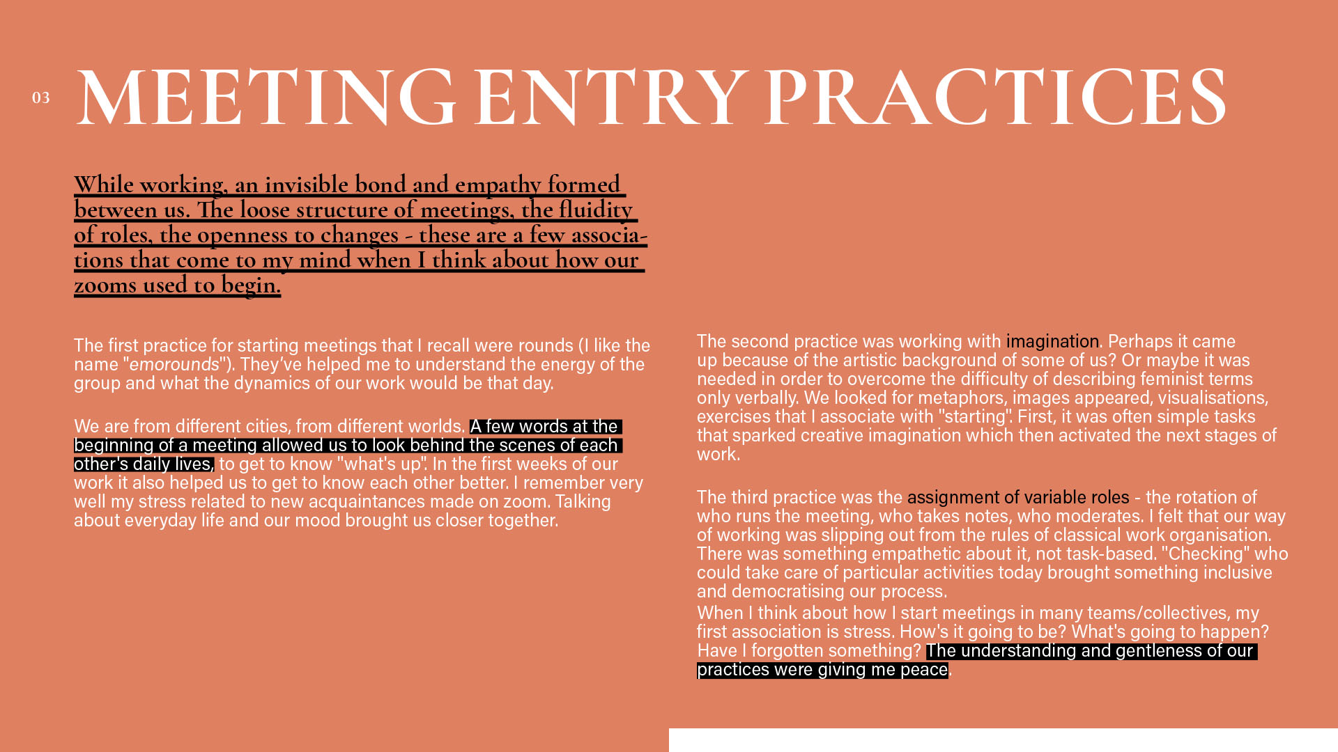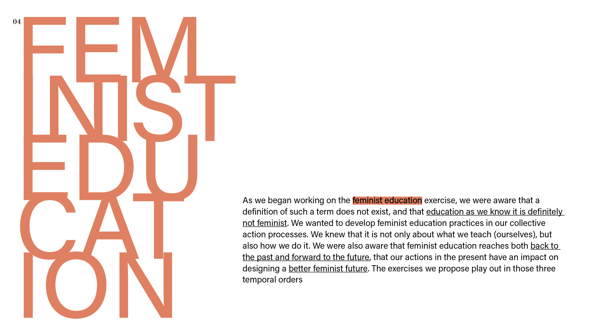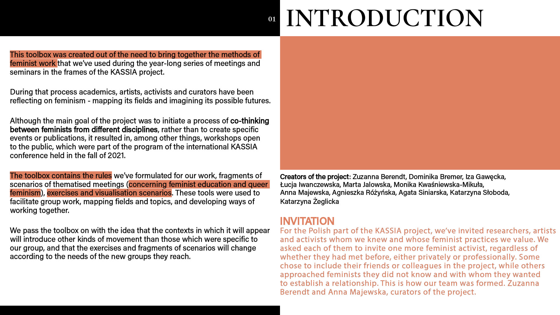 Monika: If you would like to share this, I would like to ask if there was something that was difficult for you during our working together and how did you cope with it? Or if you prefer more generally: what methods do you have of dealing with difficulties arising during the work? / Jeśli chcesz się tym podzielić, to chciałabym zapytać, czy było coś, co sprawiało ci trudność w czasie naszej współpracy i jak sobie z tym radziłaś/radziłyśmy? A jeśli wolisz ogólniej: jakie masz metody radzenia sobie z trudnościami pojawiającymi się w czasie współpracy? Dominika: At the very beginning of the project, when we were all getting acquainted with the issues we were going to discuss, the way of working, the kind of cooperation with kainkollektiv, etc., there were moments when I was afraid of my competences – that I didn't know enough, that I wouldn't find myself in the discussed contents. After one conversation with Anna and Zuza, these fears disappeared. Then I had difficulties understanding everything and keeping up with everything we were working on. This was largely due to my busy life and the difficulties I was experiencing at the time. If I didn't know something, I would contact one or two people from the project to ask around, talk things through, figure things out. That helped a lot. Meetings in smaller teams also helped (for example, when working on a meeting about feminist education). My doubts and difficulties appeared less and less frequently later on, as we got to know each other better. I myself managed to believe that my presence is valuable in a group of extremely interesting, beautiful, good and valuable people. I am incredibly grateful to have met you, because I think that the kind of collaboration we experienced made me feel more confident (this is my personal thanks). I think that's the power of sisterhood.
