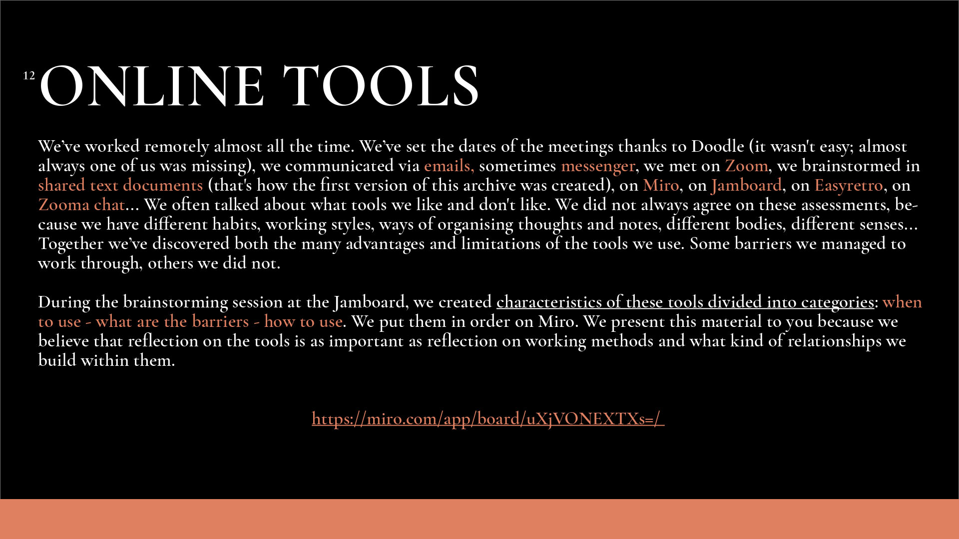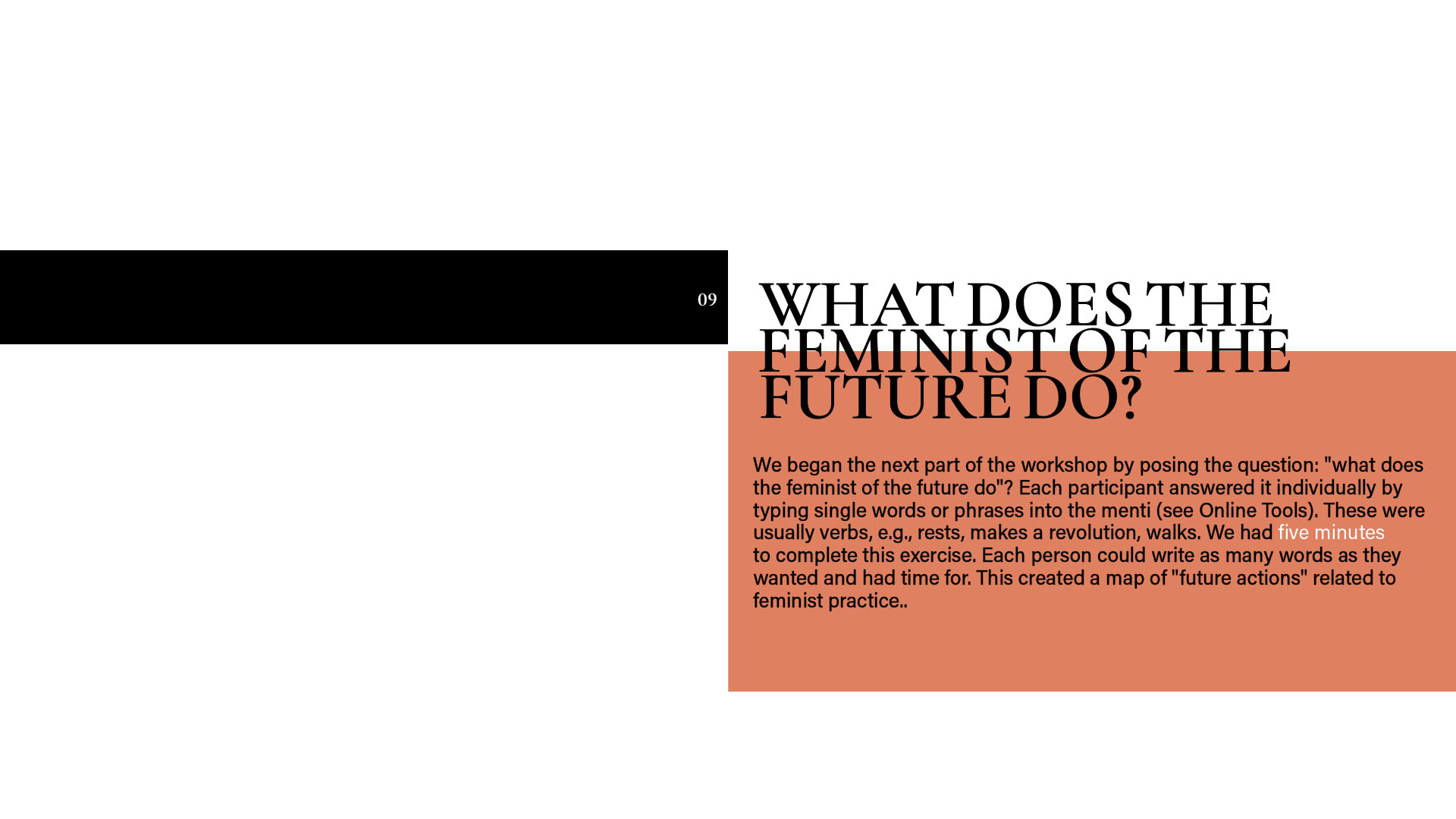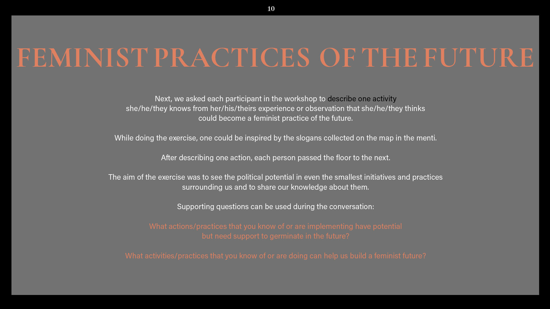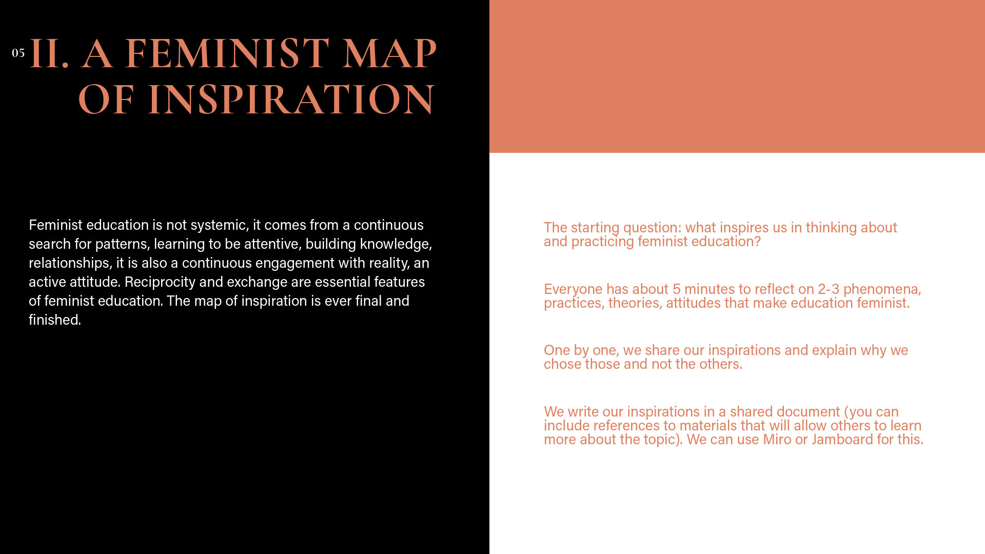Monika: If you would like to share this, I would like to ask if there was something that was difficult for you during our working together and how did you cope with it? Or if you prefer more generally: what methods do you have of dealing with difficulties arising during the work? / Jeśli chcesz się tym podzielić, to chciałabym zapytać, czy było coś, co sprawiało ci trudność w czasie naszej współpracy i jak sobie z tym radziłaś/radziłyśmy? A jeśli wolisz ogólniej: jakie masz metody radzenia sobie z trudnościami pojawiającymi się w czasie współpracy? Dominika: At the very beginning of the project, when we were all getting acquainted with the issues we were going to discuss, the way of working, the kind of cooperation with kainkollektiv, etc., there were moments when I was afraid of my competences – that I didn't know enough, that I wouldn't find myself in the discussed contents. After one conversation with Anna and Zuza, these fears disappeared. Then I had difficulties understanding everything and keeping up with everything we were working on. This was largely due to my busy life and the difficulties I was experiencing at the time. If I didn't know something, I would contact one or two people from the project to ask around, talk things through, figure things out. That helped a lot. Meetings in smaller teams also helped (for example, when working on a meeting about feminist education). My doubts and difficulties appeared less and less frequently later on, as we got to know each other better. I myself managed to believe that my presence is valuable in a group of extremely interesting, beautiful, good and valuable people. I am incredibly grateful to have met you, because I think that the kind of collaboration we experienced made me feel more confident (this is my personal thanks). I think that's the power of sisterhood.