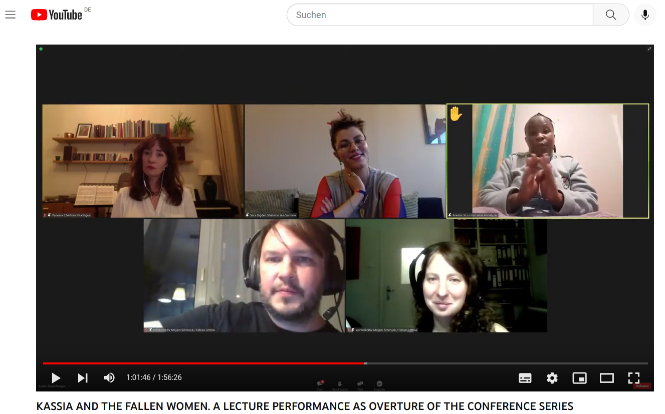 Here you can find the complete recording of the Online Conference Series Part 1 with the title: KASSIA AND THE FALLEN WOMEN. AS OVERTURE OF THE CONFERENCE SERIES Speakers: Sara Bigdeli Shamloo, Anelisa Stuurman, Vanessa Chartrand-Rodrigue Moderation: Mirjam Schmuck & Fabian Lettow (kainkollektiv) hosted by: kainkollektiv October 2021