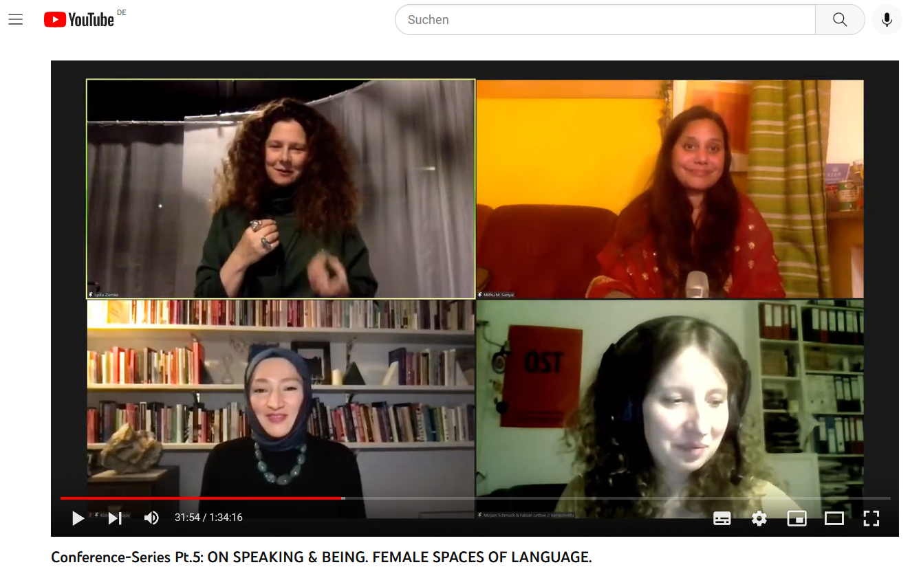 Here you can find the complete recording of the Online Conference Series Part 5 with the title: ON SPEAKING & BEING. FEMALE SPACES OF LANGUAGE Speakers: Mithu Sanyal, Kübra Gümüşay Moderation: Mirjam Schmuck (kainkollektiv) & Lydia Ziemke (suite42) hosted by: kainkollektiv September 2021