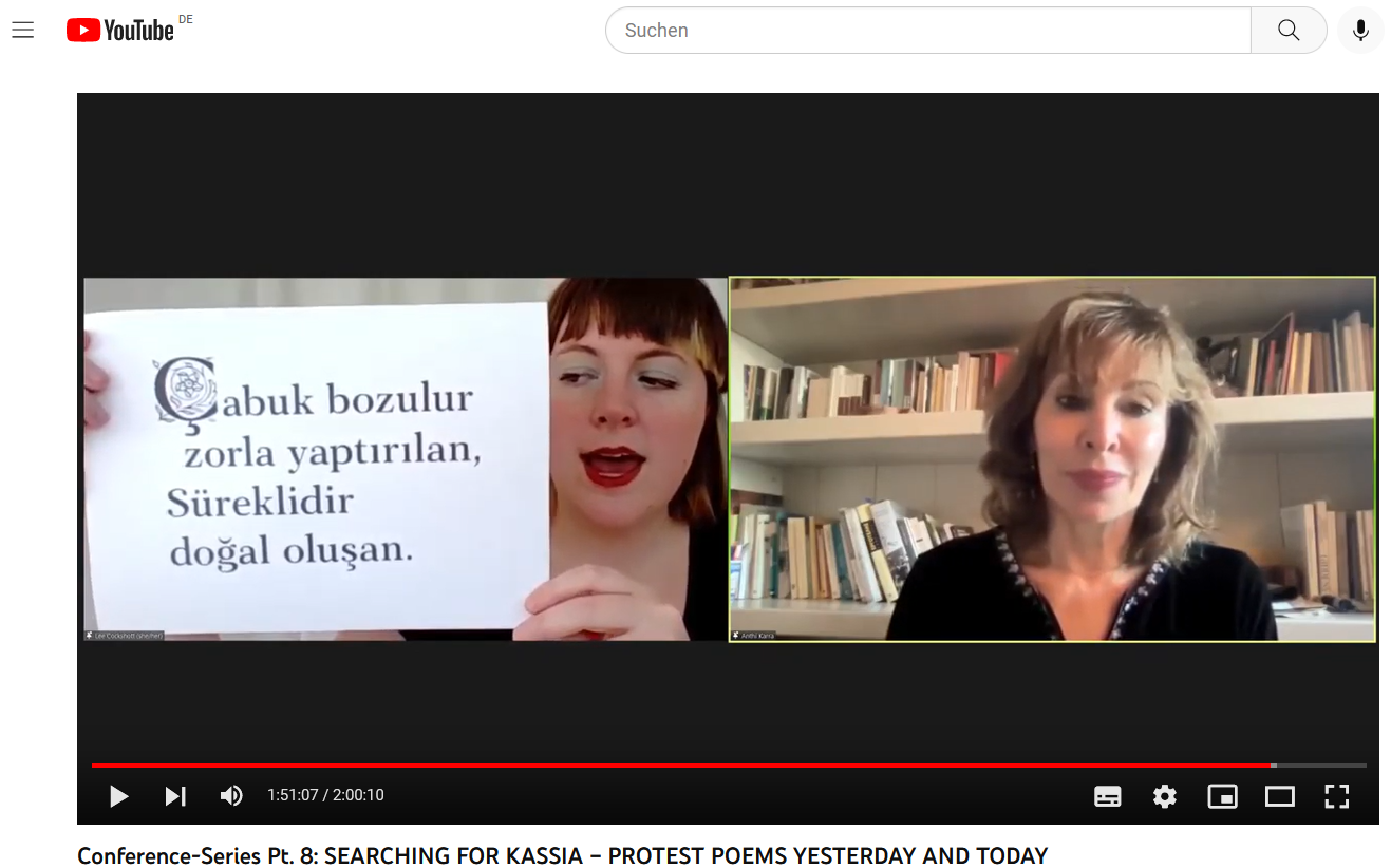 TRANSLATION IN TURKISH Here you can find the complete recording of the Online Conference Series Part 8 with the title: Searching for Kassia – Protest Poems Yesterday and Today – a (virtual) meeting with Chinese, Georgian, Russian, Ethiopian, Armenian, Kurdish, South Korean/Danish and Turkish women poets Speakers: Lee Cockshott, Christine Yohannes, Tang Siu Wa, Narîn Yukler, Tuğçe Aydin, Egana Djabbarova, Maja Lee Langvad, Karin Karakaşlı Moderation: Meral Akkent & Aylin Vartanyan hosted by: Gender Museum Istanbul October 2021