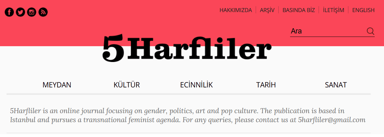 about 5Harfliler 5Harfliler is an online journal focusing on gender, politics, art and pop culture. The publication is based in Istanbul and pursues a transnational feminist agenda.