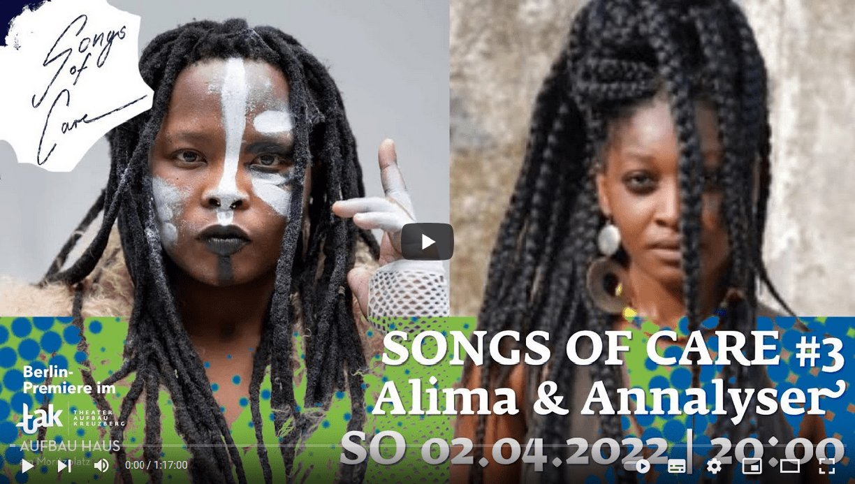 External Link to the concert from ANNALYZER and ALIMA at tak Berlin, 2022. The concert took place as part of the 'SONGS OF CARE' concert series in cooperation with kainkollekitv and tak Theater Aufbau Kreuzberg Berlin